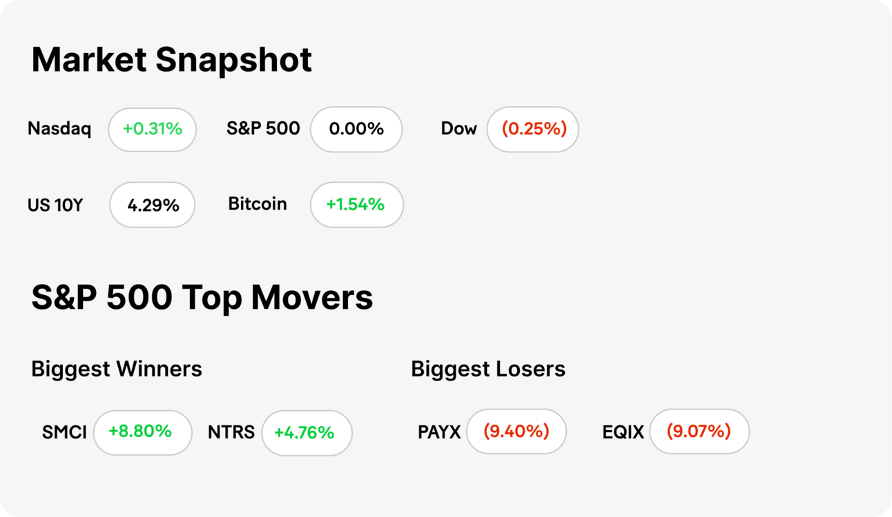 MARKET RECAP → Markets were mixed today as the S&P and Dow slightly pulled back while the Nasdaq edged higher, staying near record levels. Oil prices stabilized after this week’s sharp drop, helping ease some inflation concerns. Bitcoin (BTC) extended its rally, reflecting continued risk-on sentiment as geopolitical tensions remain subdued.