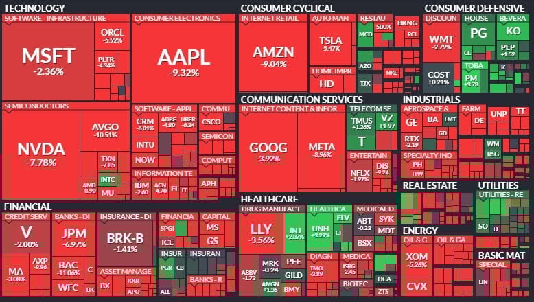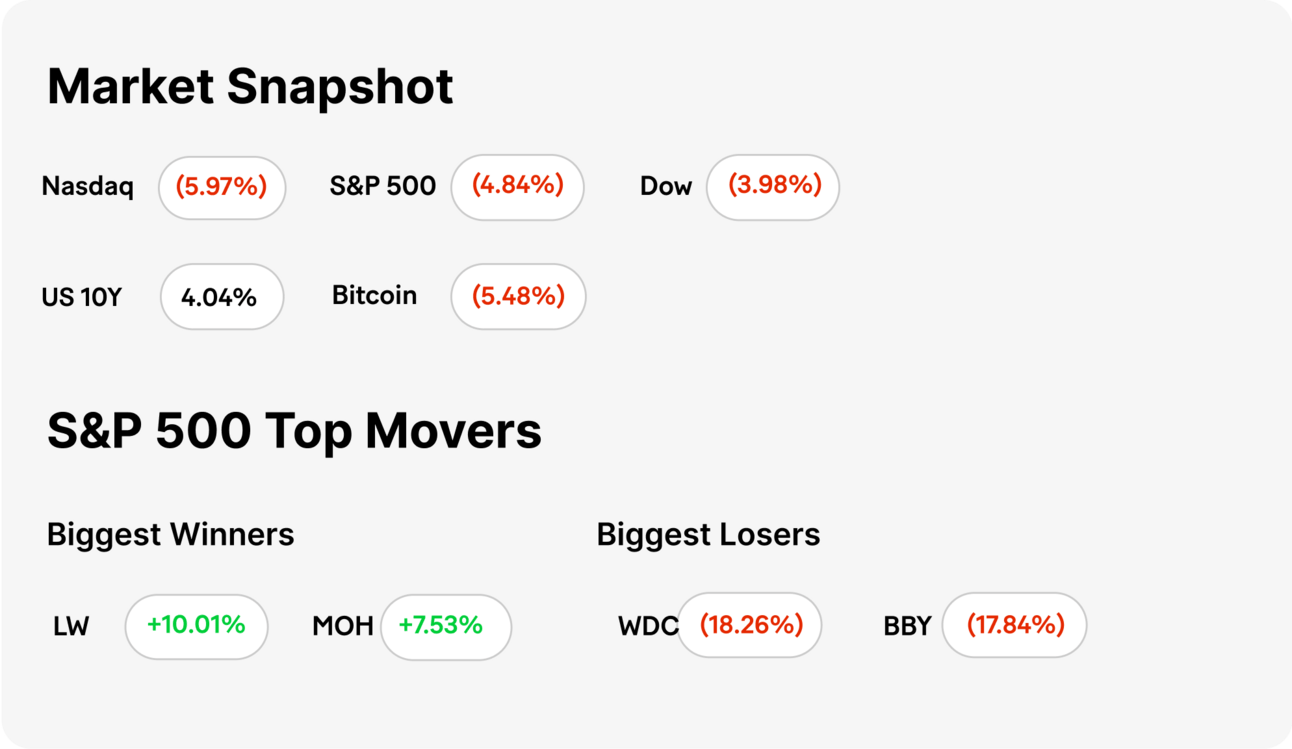 MARKET RECAP → Stocks plummeted on Tariff Thursday, sending the S&P 500 (VOO) into correction territory for its biggest single-day loss since the pandemic-era selloff in 2020.