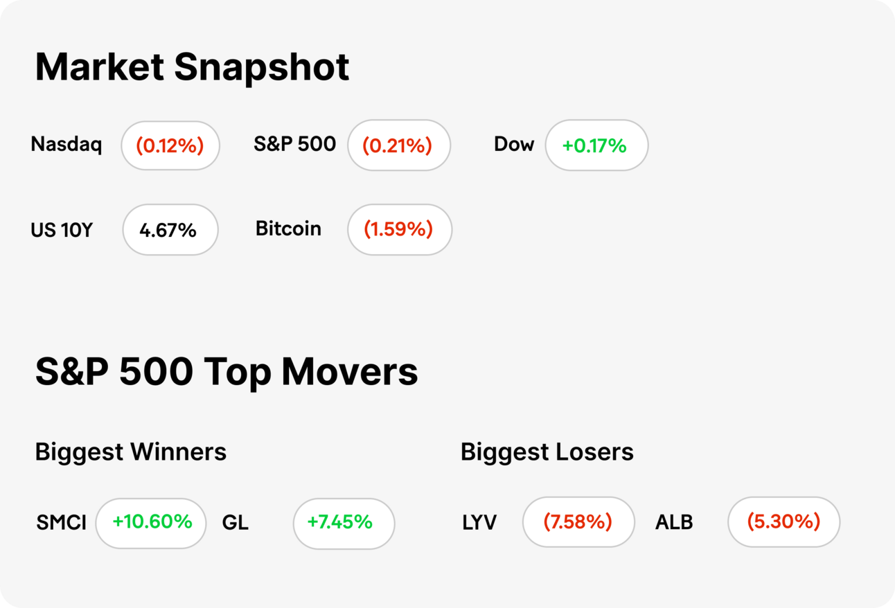 MARKET RECAP → Stocks moved lower Tuesday after Fed Chair Jerome Powell said rates might need to stay high for longer due to a “lack of further progress” this year on inflation.