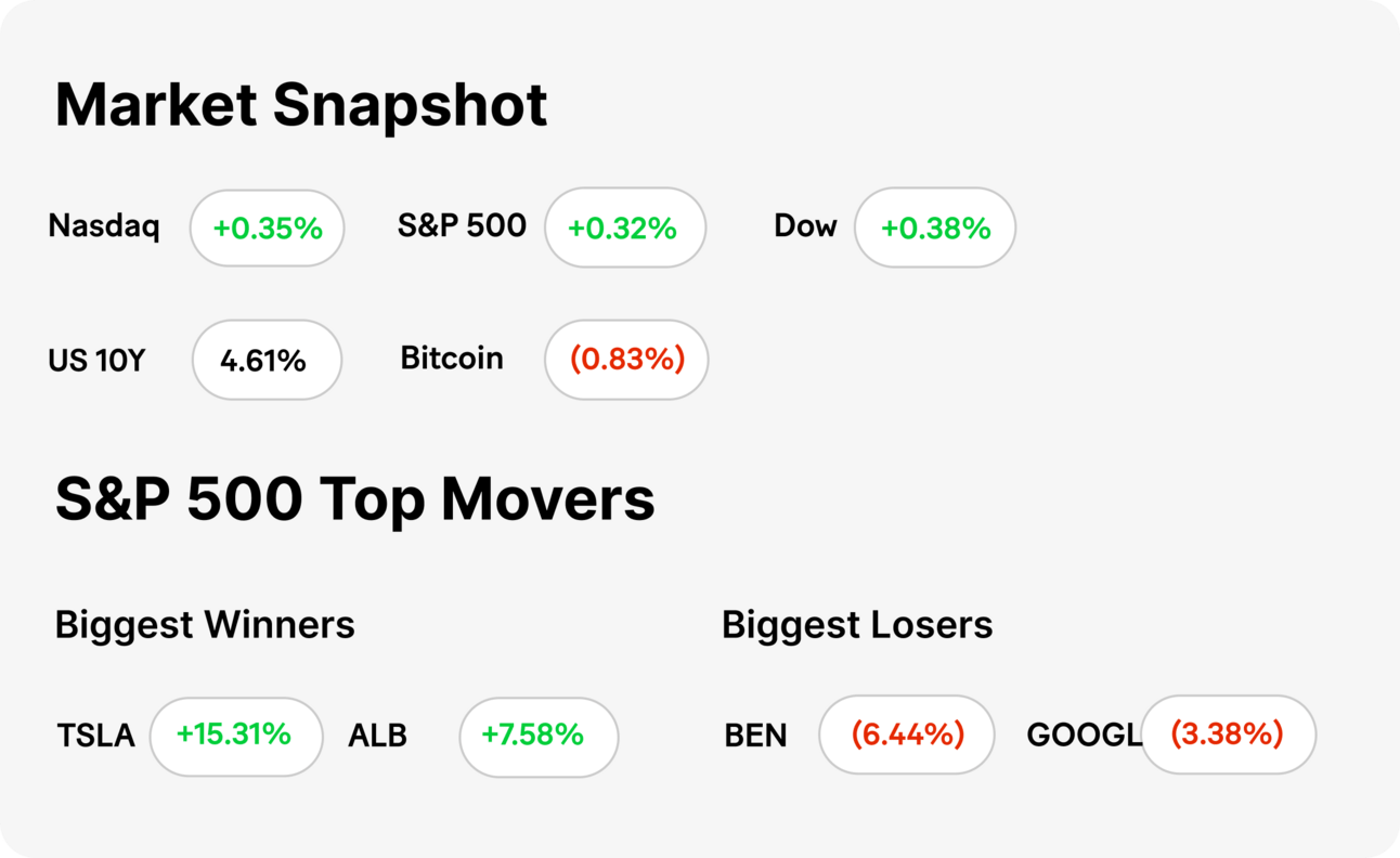 MARKET RECAP → On Monday, the Dow (DIA) surged over 100 points and the Nasdaq (QQQ) closed higher, aided by a 15% rally in Tesla (TSLA) shares after the company cleared a major regulatory hurdle. This boost came as investors braced for a busy week filled with corporate earnings reports and a Federal Reserve meeting, setting a positive tone for the market.