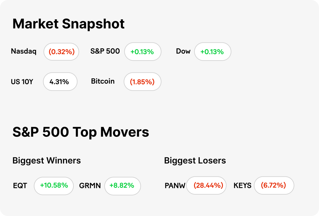 📉 Earnings Exceed, Guidance Recedes: Palo Alto Networks saw its shares tumble 19% after beating earnings expectations but slashing its full-year revenue and billings forecasts. The cybersecurity giant adjusted its full-year total billings down to $10.1-$10.2 billion from $10.7-$10.8 billion, with revenue projections also dialed back to $7.95-$8 billion from $8.15-$8.2 billion.