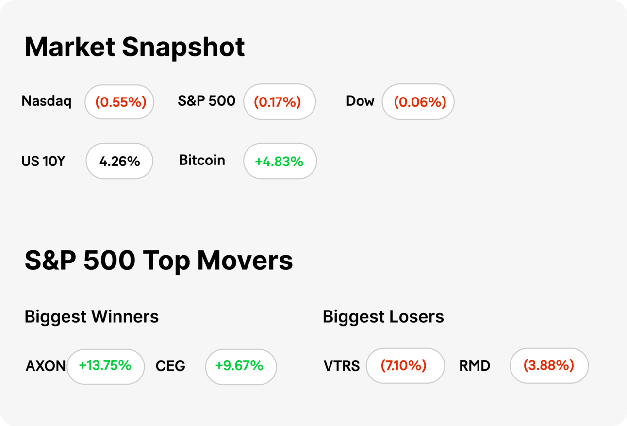 MARKET RECAP → Wednesday witnessed a decline in stocks as investors turned their gaze towards an imminent key inflation report scheduled for tomorrow. The S&P 500 (VOO), Nasdaq Composite (QQQ) and The Dow Jones (DIA) all closed in the red. Bitcoin (BTC) continued to trend higher, exceeding $60K.
