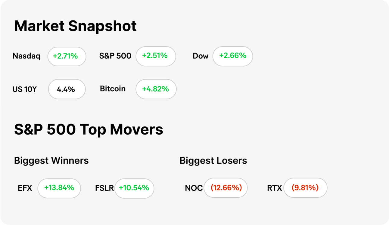 MARKET RECAP → Stocks bounced back Tuesday as investors bet on a potential thaw in U.S.-China trade tensions, following Monday’s sharp sell-off.