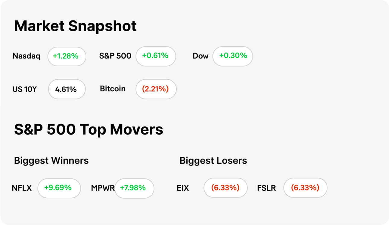 MARKET RECAP → Stocks surged on Wednesday, with the S&P 500 (VOO) reaching another record high. Optimism surrounding advancements in artificial intelligence and the start of President Donald Trump’s new term bolstered investor sentiment.