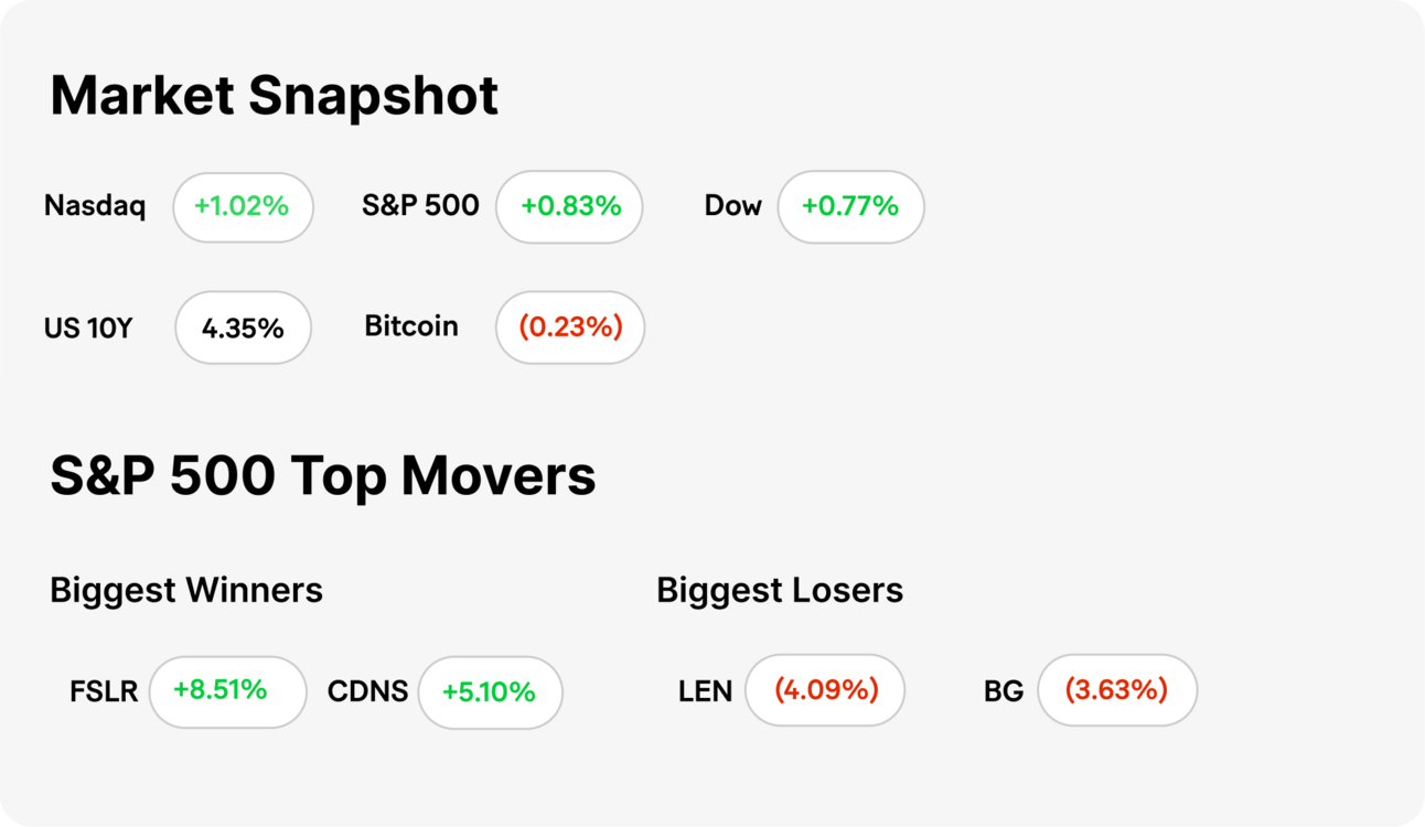 Broad-Based Gains Across Sectors: Financials, tech, and consumer discretionary stocks led the charge as bond yields stabilized and investors rotated back into growth and cyclical plays.