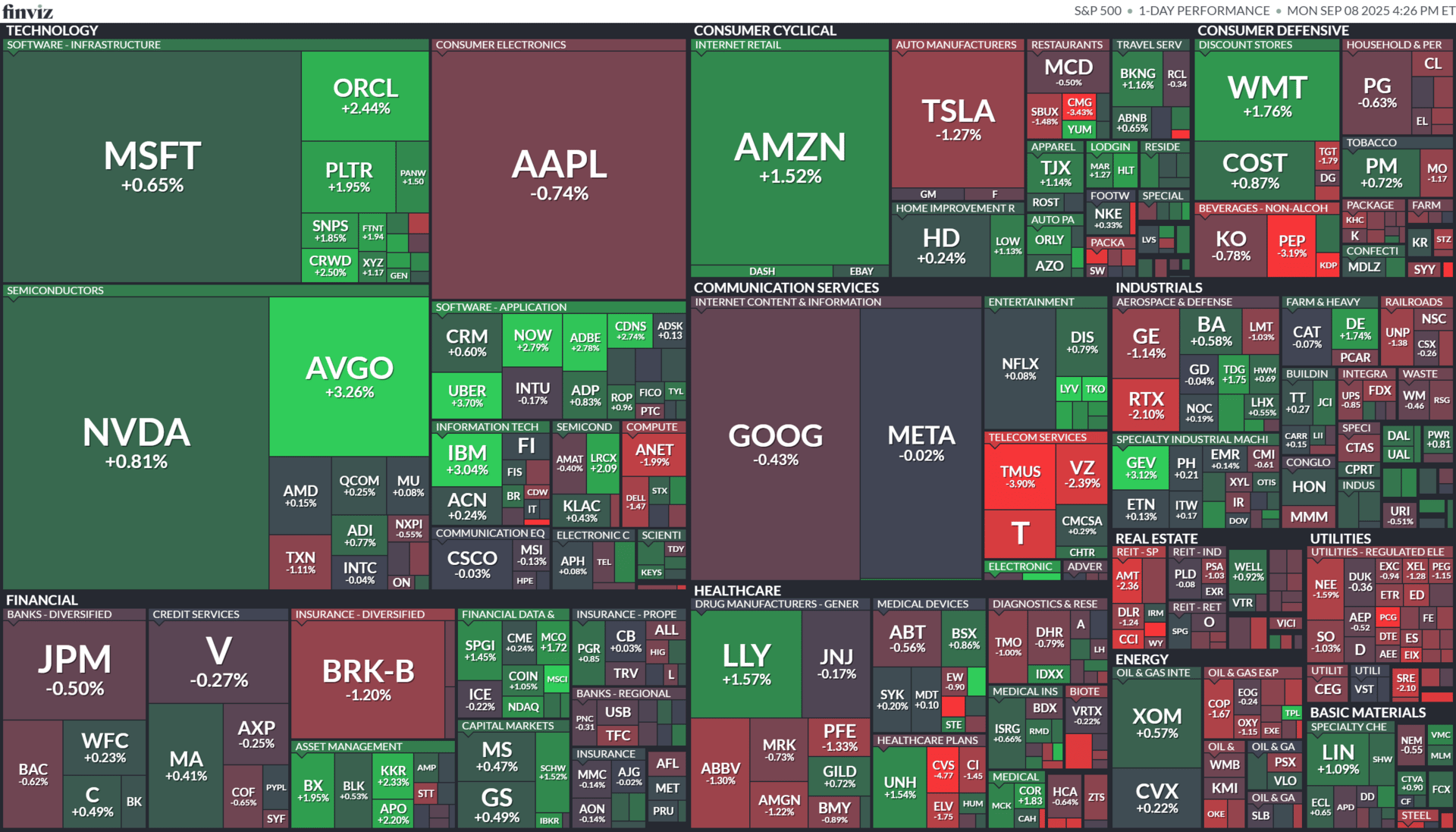 MARKET RECAP → The Nasdaq Composite (QQQ) reached an all time high on Monday as tech & AI stocks continued to lift the market higher. Meanwhile, traders geared up for two important inflation reports this week and a Fed interest rate decision next week (9/17).