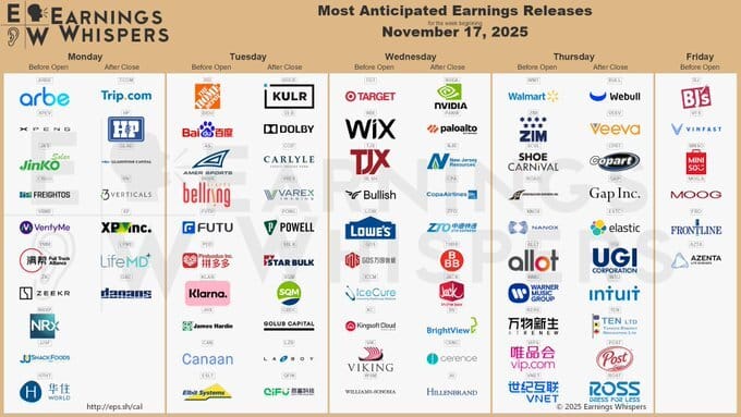 🆘 HUANG’S $500B TIGHTROPE → Q3 isn’t just about another monster quarter for Nvidia (NVDA); it’s a stress test of whether Huang’s half-trillion-dollar AI order book, capex-heavy partnerships, and strategic equity deals can justify god-mode expectations in a stock already priced like the AI end boss. NVIDIA reports earnings after the close of trading on Wednesday (11/19).