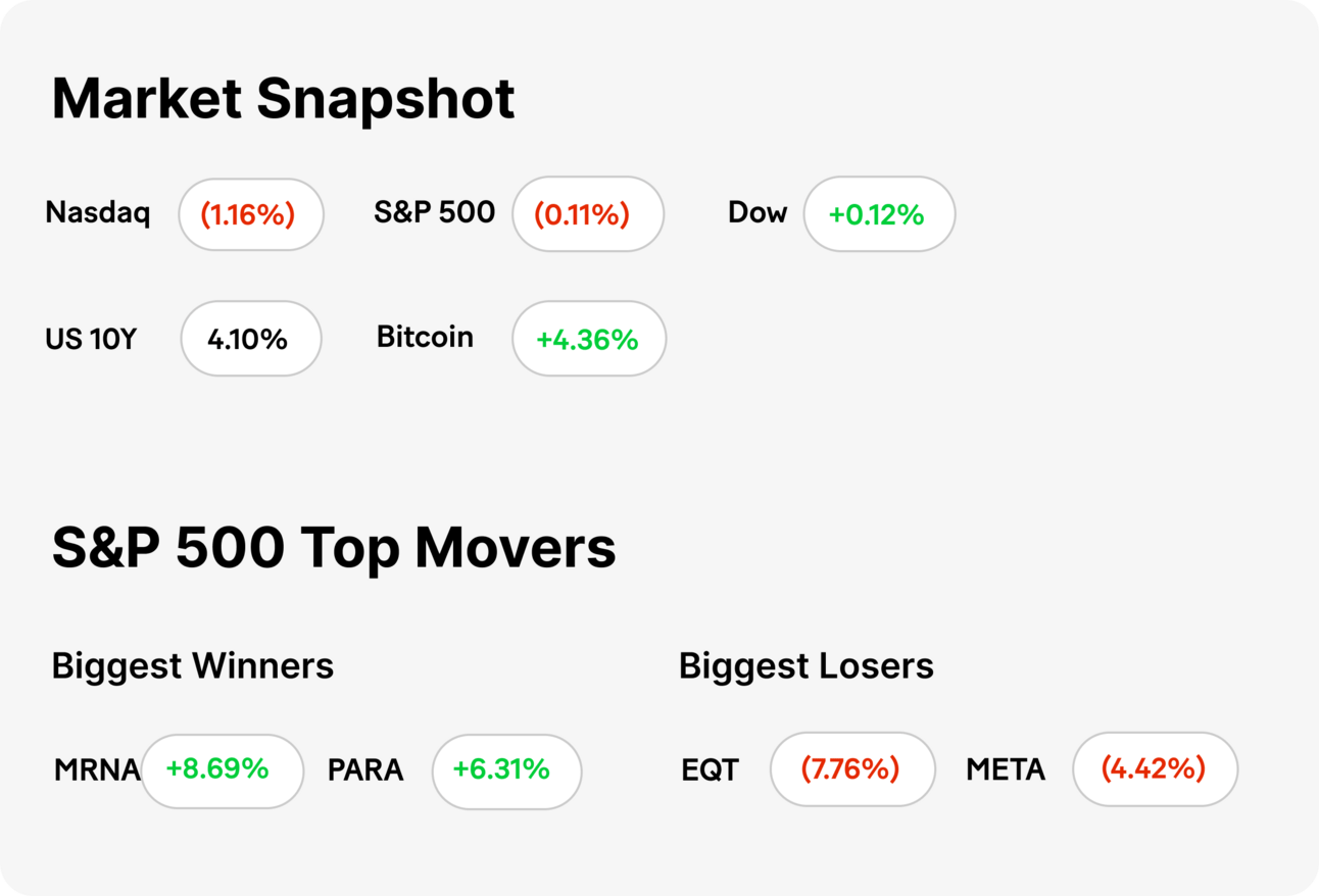 MARKET RECAP → Stocks closed lower Monday as the rally cooled off. Big tech names, including NVIDIA (NVDA), Super Micro Computer (SMCI), and Meta (META), all fell as investors questioned the recent AI hype.