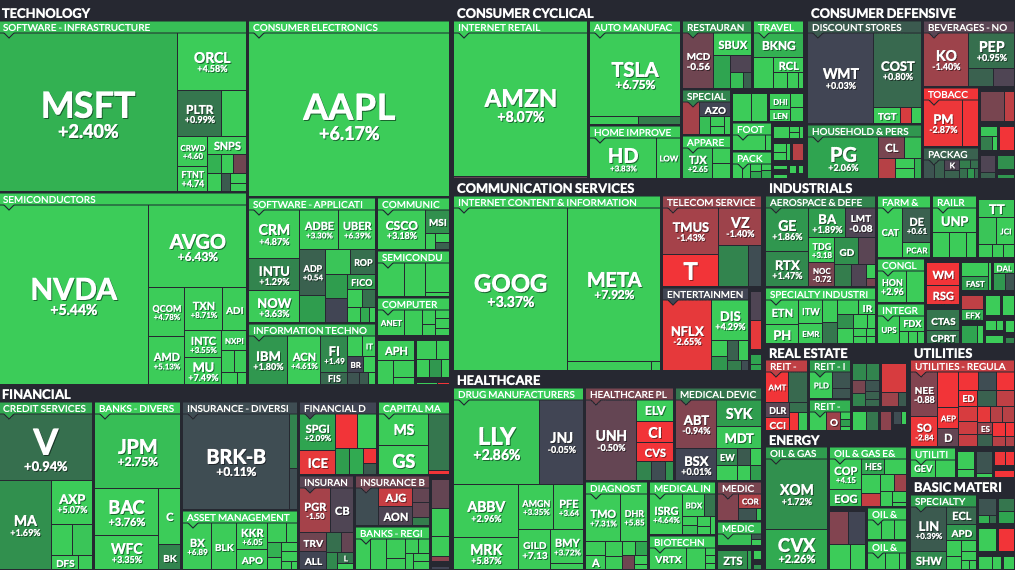 Markets Respond Positively: 📈 The announcement led to a surge in global markets. The Dow Jones Industrial Average (DIA) rose by over 1,000 points, the S&P 500 (VOO) increased by 3.26%, and the Nasdaq Composite (QQQ) climbed 4.35%. Tech and retail sectors experienced notable gains, with companies like Nvidia (NVDA), Meta (META), and Tesla (TSLA) seeing significant stock price increases.