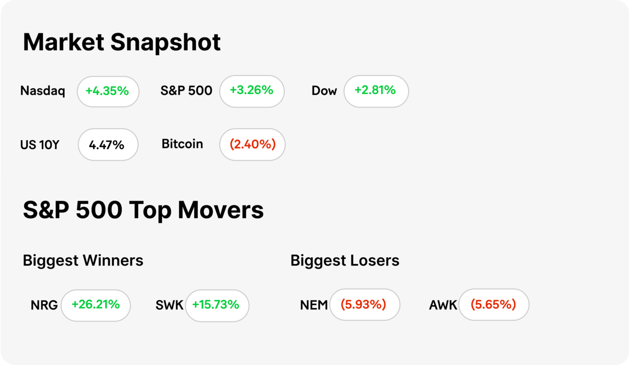MARKET RECAP → U.S. stocks surged Monday after the U.S. and China agreed to temporarily roll back tariffs during weekend talks in Switzerland, boosting optimism that a full-blown trade war—and potential recession—might be avoided.