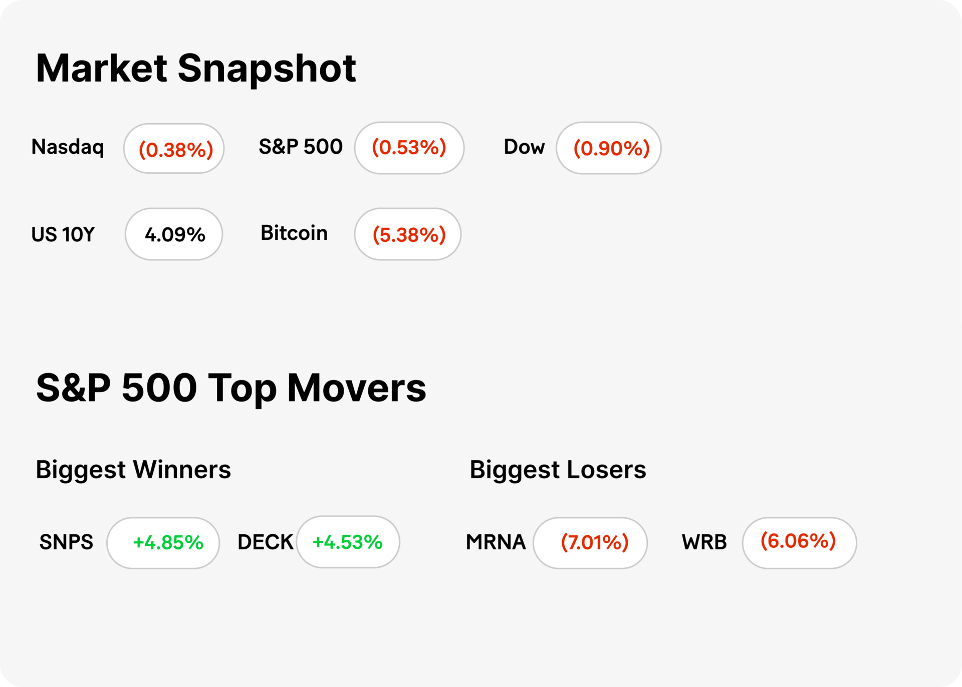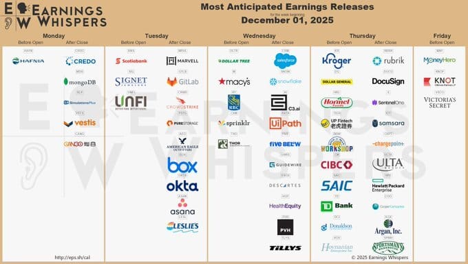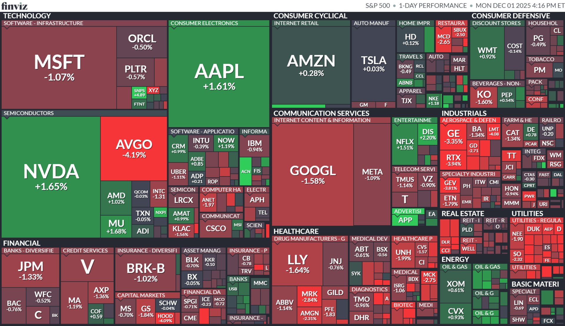 🧾MARKET RECAP → Stocks fell on Monday, following cryptocurrencies lower, as volatility continued into December’s trading month.