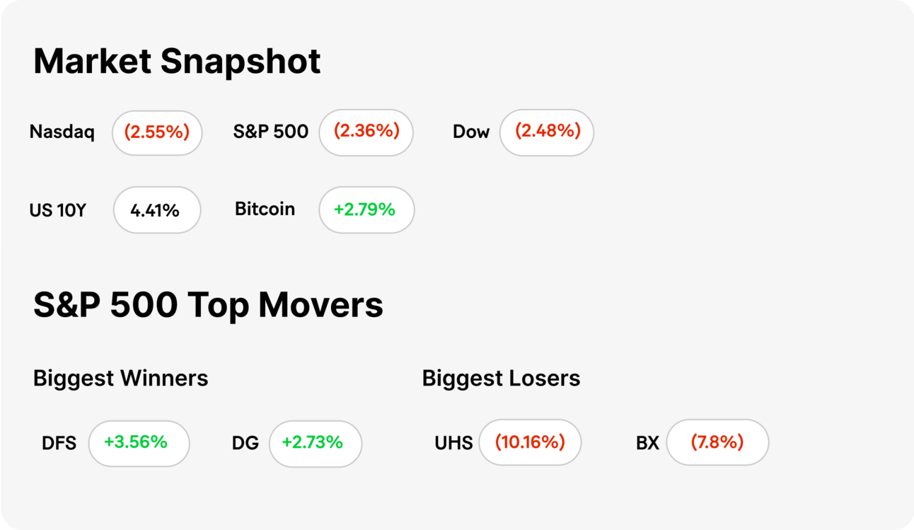 MARKET RECAP → Stocks dropped Monday as President Trump escalated his attacks on Fed Chair Jerome Powell, stoking concerns over central bank independence and offering traders no clear progress on global trade negotiations.